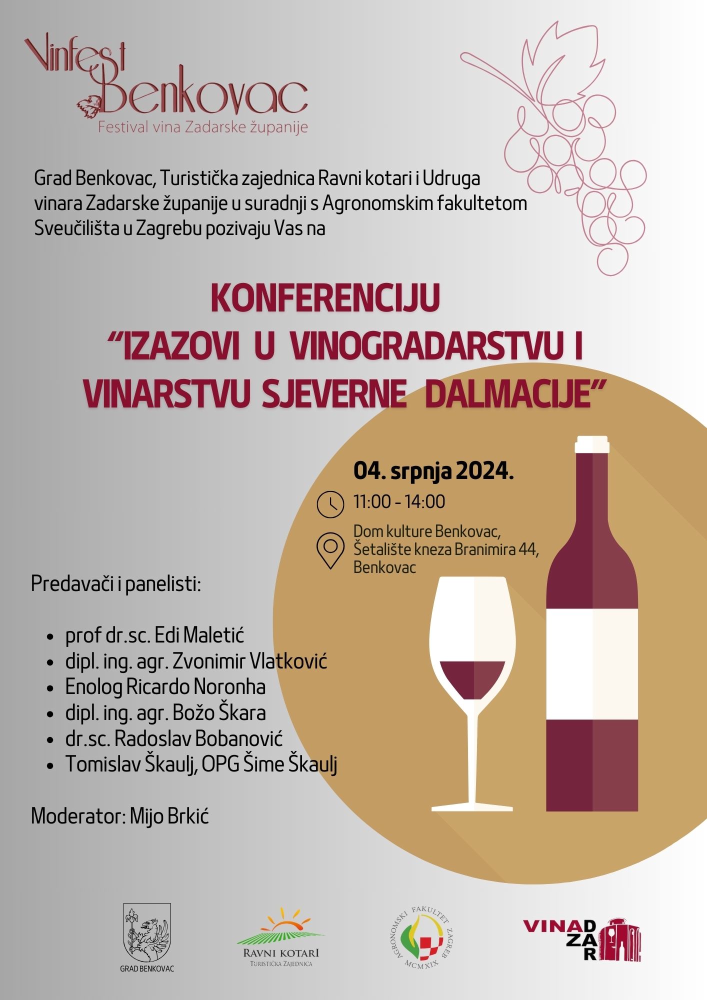 U Domu kulture Benkovac u četvrtak, 04. srpnja 2024. godine s početkom u 11.00 sati održat će se konferencija „Izazovi u vinogradarstvu i vinarstvu Sjeverne Dalmacije“ .