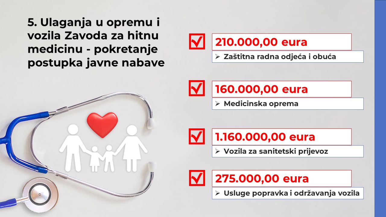 „Krajem prošle godine stiglo je sedam novih vozila saniteta, a tijekom ove godine očekuje se preuzimanje osam vozila za hitnu pomoć čija vrijednost iznosi 1,24 milijuna eura. Time se osigurava da timovi hitne pomoći na terenu raspolažu najmodernijim sredstvima za spašavanje života“, istaknula je Mijić.
