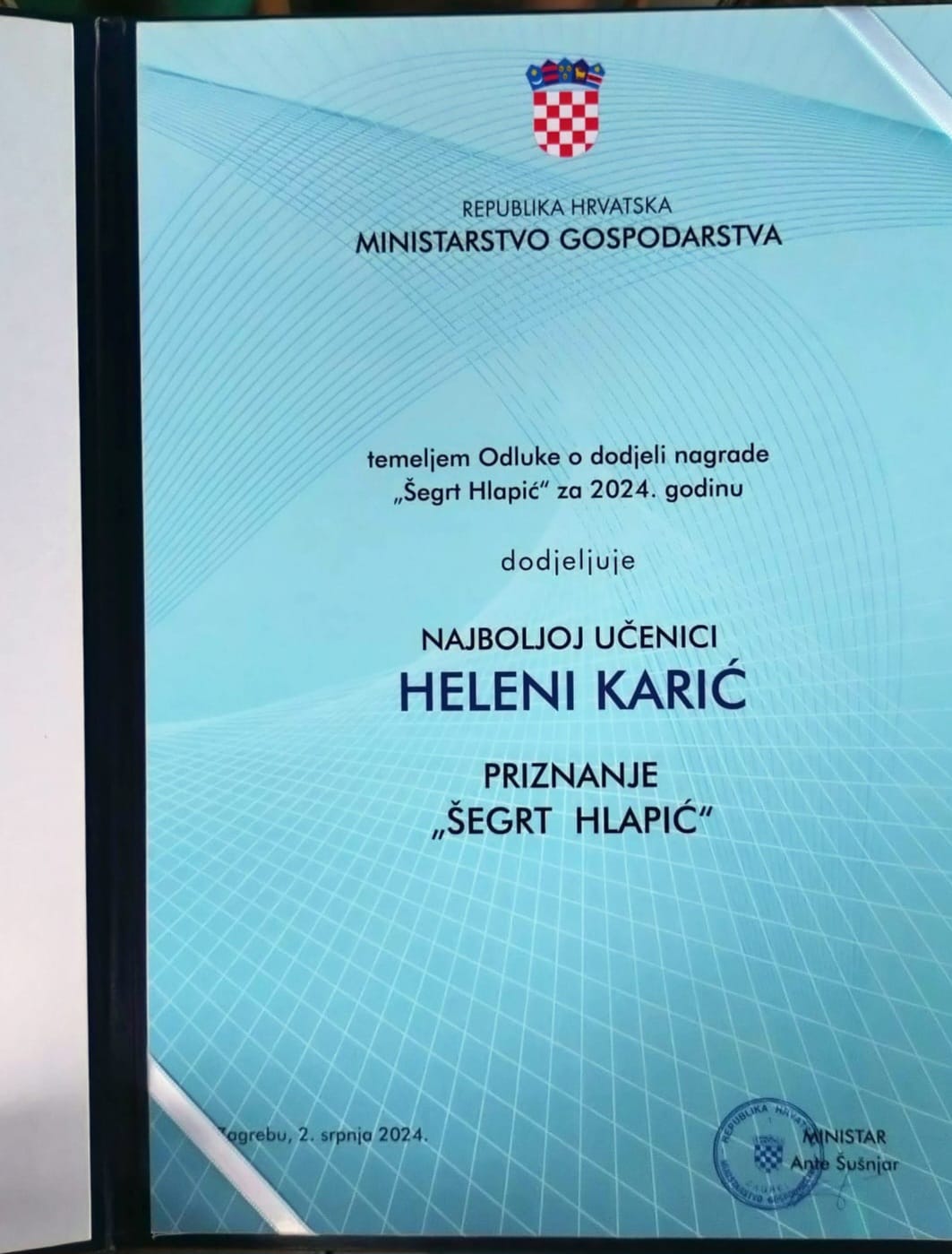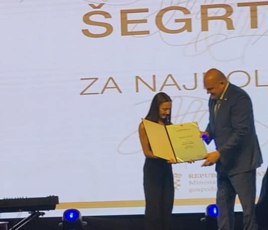 Ovo prestižno priznanje našoj učenici dodijelilo je Ministarstvo gospodarstva Republike Hrvatske na svečanoj akademiji povodom 30 godina Hrvatske obrtničke komore.