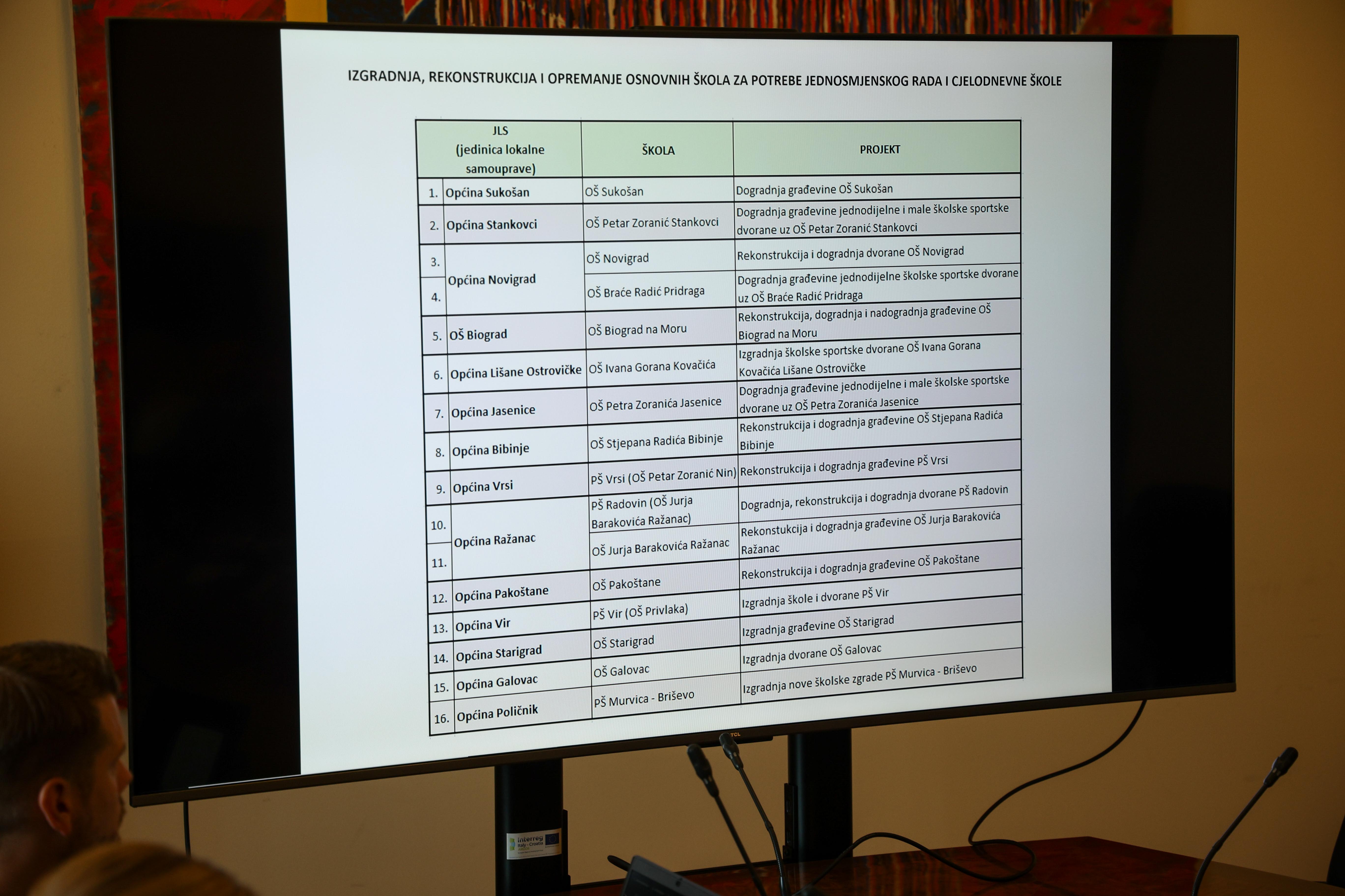Zadarska županija trenutno priprema prijavu 15 osnovnih škola na aktualni poziv za sufinanciranje iz NPOO-a. Rok za prijavu projekata je 30. rujna 2025. godine. Do sada je Županija dobila 14 suglasnosti Ministarstva znanosti i obrazovanja (MZOM) te prijavila četiri projekta. Od tih prijava, već su dobivene tri odluke o financiranju, a dva ugovora su već potpisana: za dogradnju Osnovne škole Sukošan i za dvoranu u Stankovcima. Pročelnik Šimunić je najavio da se sljedeći tjedan očekuje potpisivanje trećeg ugovora, za dogradnju OŠ Biograd. Četvrti zahtjev, koji je predan, odnosi se na izgradnju športske dvorane u Osnovnoj školi braće Radić - Pridraga.